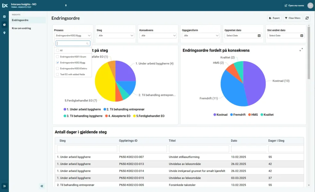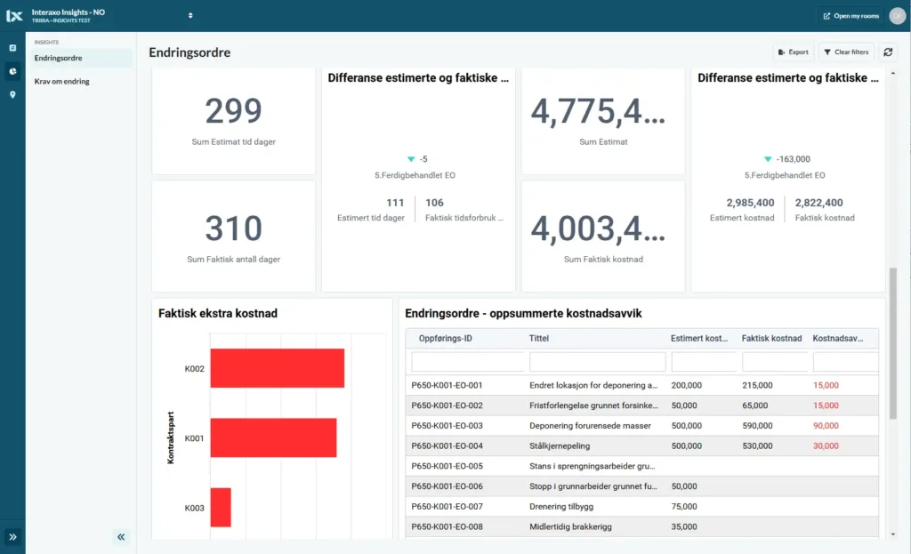 Med Interaxo Insights får dere en klar, visuell oppsummering av endringsdata under Endringsordre og Krav om endring.