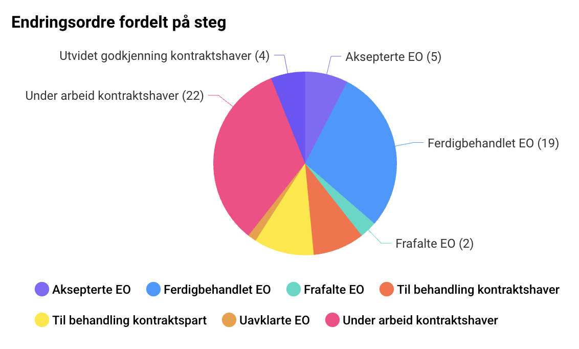 Dashbordene visualiserer antall og typer endringer over tid, som bidrar til å avdekke trender og mønstre – f.eks. endringsordre som hoper seg opp i enkelte faser eller fagområder.