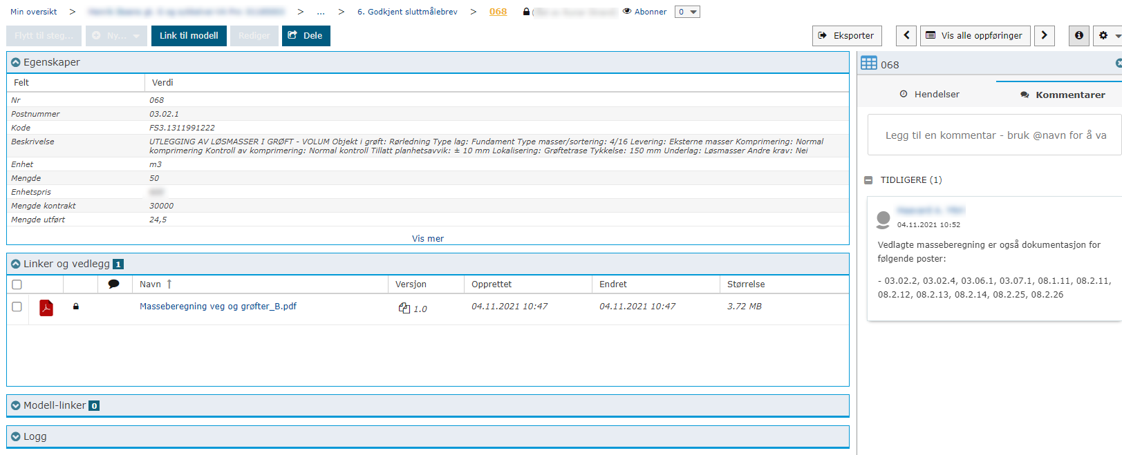 Skjermbilde av et godkjent sluttmålebrev med kommentar og vedlegg